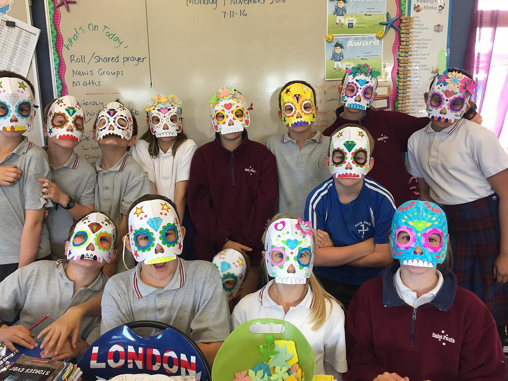 The students have decorated Calavera (sugar skulls) which are used in the Mexican celebration of the Day of the Dead (Día de Muertos) and the Catholic holy day All Souls day.